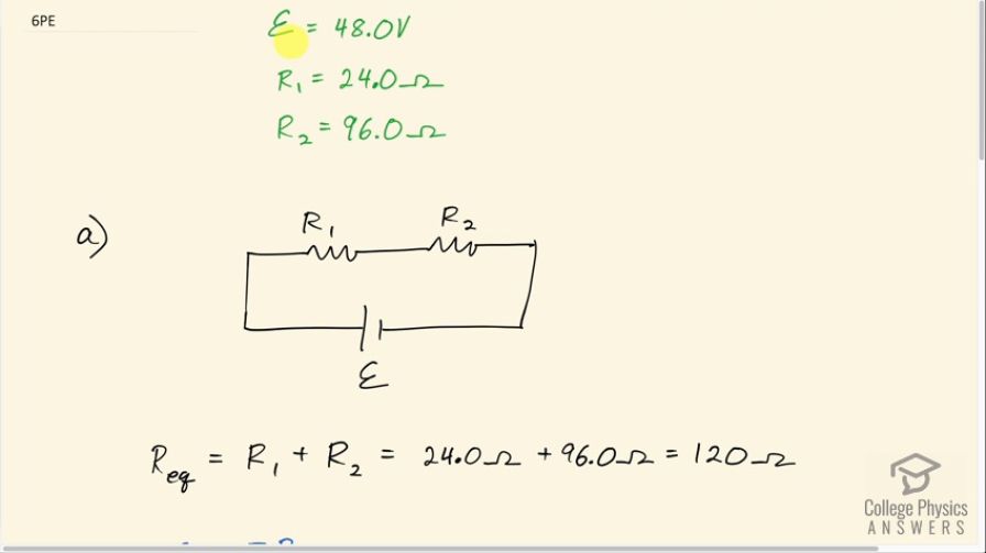 This is College Physics Answers with Shaun Dychko. We have a 48.0 volt battery and voltage for a battery is traditionally written with this scripted ε for emf; we have a resistor—resistor one we will call it—is 24.0 ohms and resistor two is 96.0 ohms and part (a) says put these resistors in series and then figure out the current and power through each resistor. So to find the current, we need to figure out what is the equivalent resistance of these two resistors so we have to imagine a circuit with only a single resistor— R eq for 'equivalent'— and what resistance would this need to be to have the same resistance as these two separate resistors in series and once we know that, we can figure out what the current is in this circuit which will be the same as the current in this circuit. So the equivalent resistance for resistors in series is the regular sum of the resistances. So that's 24.0 ohms plus 96.0 ohms to make 120 ohms. Now the Ohm's law which says voltage is current times resistance can be rearranged to solve for I by dividing both sides by the equivalent resistance and so then the current then is the emf divided by the equivalent resistance so that's 48.0 volts divided by 120 ohms which is 0.400 amps and that's gonna be the same as the current through resistor one and the current through resistor two because when they are in series like this, the current through each circuit element will be the same. So the power dissipated by resistor one is going to be the current through it squared multiplied by resistor one. So that's 0.400 amps times itself times 24.0 ohms which makes 3.84 watts and for resistor two, the power dissipated will be 0.400 amps squared times 96.0 ohms which is 15.4 watts. Now in part (b), we are asked to answer the same questions about the power dissipated in each of the resistors and the current through each resistor when they are connected in parallel and so here's a drawing of that. And so each resistor will experience the full voltage of the battery and I am sort of using the letter V and the scripted ε interchangeably here—I hope that's not too confusing—but this is Ohm's law here which says V equals IR and we can divide both sides by R to solve for V and then we have the current one then is going to be this emf divided by resistor one. So that's 48.0 volts divided by 24.0 ohms, which is 2.00 amps and the current through the second resistor is that same emf—48.0 volts—divided by resistor two, which is 96.0 ohms, and this makes 0.500 amps. And the power dissipated by the first resistor will be the voltage across it squared divided by its resistance so that's 48.0 volts squared divided by 24.0 ohms, which is 96.0 watts and the power dissipated by resistor two will be the same 48.0 volts squared divided by 96.0 ohms, which is 24.0 watts.