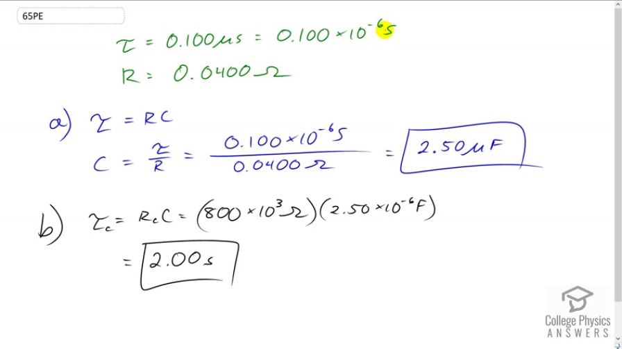 This is College Physics Answers with Shaun Dychko. We know that the time constant for this photographic flash is 0.1 micro seconds which is 0.1 times ten to the minus six seconds and the resistance of a circuit during discharge is 0.04 Ohms. So the time constant tau is equals resistance multiplied by capacitance. And we can solve for the capacitance by dividing both sides by R. And so we have a time constant of 0.10 times ten to the minus six seconds and a circuit with a resistance of 0.04 Ohms. The capacitance must be 2.5 micro Farads. Now when this circuit is charging, because a flash has to charge, a capacitor has to charge in order to discharge to flash again later. The time comes that will be this resistance while charging multiplied by the capacitance. So that’s 800 times ten to the three Ohms times 2.5 times ten to the minus six Farads. And that gives 2.00 seconds.