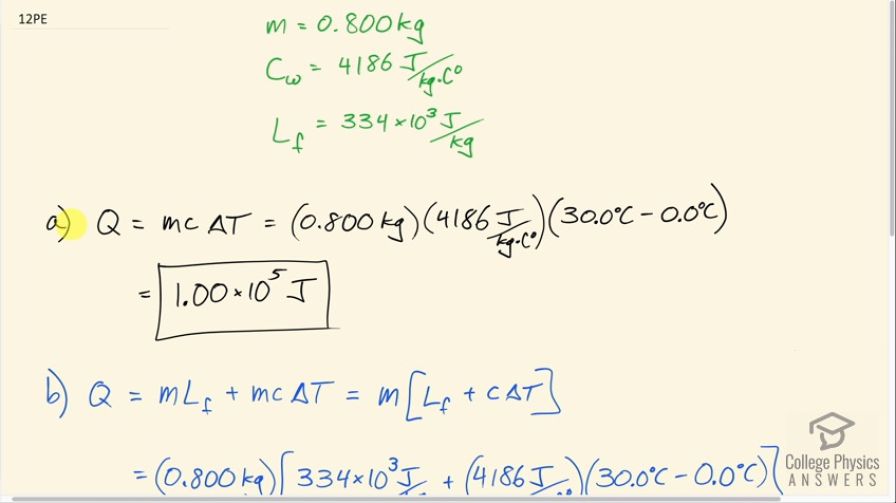 This is College Physics Answers with Shaun Dychko. We are going to compare the absorption of heat energy between a bag of water, which starts at 0.0 degrees Celsius, and compare that to the same bag but with ice in it first which also has a temperature of 0.0 degrees Celsius. So the only difference is that one starts as liquid and the other starts as ice; they both start with the same temperature of 0.0 degrees Celsius. So we have gathered some information here: the question tells us we are dealing with 0.800 kilograms of water or ice; the specific heat of water we look up in our data tables here and it's 4186 joules per kilogram per Celsius degree and the latent heat of fusion for water is 334 kilojoules per kilogram so I'll write that as 334 times 10 to the 3 joules per kilogram. So in part (a) we have just water and it's going to absorb an amount of heat equal to its mass times its specific heat times the change in temperature. So that's 0.800 kilograms times 4186 joules per kilogram per Celsius degree times 30.0 degrees Celsius— final temperature— minus 0.0 degrees Celsius— initial temperature— and that is 1.00 times 10 to the 5 joules of heat energy will be absorbed. In part (b), we have that same amount of heat energy needed to change its temperature but before that, we also are going to absorb some energy due to melting the ice and that will be an amount of its mass multiplied by its latent heat of fusion. So m is a common factor between these two terms so we can factor it out and we have m times latent heat of fusion plus specific heat times change in temperature. So that's 0.800 kilograms times 334 times 10 to the 3 joules per kilogram plus 4186 joules per kilogram per Celsius degree times 30.0 degrees Celsius and that is 3.68 times 10 to the 5 joules. So this shows that starting with ice is much more effective because it will absorb additional heat just to melt the ice. It will absorb an amount of heat that is increased by a factor of 3.7; if you take the amount of energy with the ice melting first divided by the scenario where they are just starting with water, 3.7 times as much energy is absorbed when starting with ice.