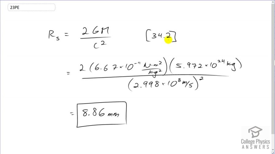 This is College Physics Answers with Shaun Dychko. We are going to calculate the size of a black hole that has the mass of the Earth. So the Schwarzschild radius from equation 2 in chapter 34 it's 2 times the gravitational constant times the mass divided by c squared. So this is the distance to the event horizon around the black hole and so that's gonna be 2 times 6.67 times 10 to the minus 11 newton meter squared per kilogram squared times mass of the Earth divided by the speed of light squared giving a radius of 8.86 millimeters.