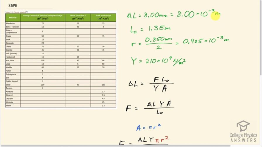 This is College Physics Answers with Shaun Dychko. A steel piano wire is being stretched 8 millimeters which we convert to 8.00 times 10 to the minus 3 meters. The original length of the piano wire is 1.35 meters and we are given the diameter of 0.850 millimeters but we want the radius because that's what we'll use for finding the cross-sectional area of the wire and the formula being πr squared for that. So we divide this diameter by 2 and then also take care of the unit conversion into meters so we have 0.425 times 10 to the minus 3 meters is the radius of the wire. The Young's modulus for steel we look up in table [5.3] and that is 210 times 10 to the 9 newtons per square meter and that's all the information we know and we'll turn to our formula here for the change in length under compression or tension for a material and it equals the tension force in this case times the original length divided by the Young's modulus times the cross-sectional area and we'll solve this for F by multiplying both sides by YA over L naught and then we get, after we switch the sides around, F equal to change in length times Young's modulus times cross-sectional area divided by original length and then we'll substitute πr squared in place of A. So we have the force then is 8.00 times 10 to the minus 3 meters— change in length— times 210 times 10 to the 9 newtons per square meter— Young's modulus for steel—times π times 0.425 times 10 to the minus 3 meters—radius—squared divided by 1.35 meters—original length— and that gives 706 newtons has to be applied by the piano tuner.