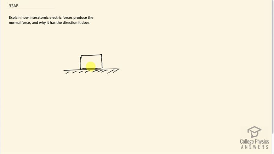 This is College Physics Answers with Shaun Dychko. The atoms within this object that is resting on the floor are surrounded by electrons. The electrons surrounding an atom in this box are going to repel from the electrons surrounding an atom in this surface here. While there are many, many electrons that are repelling each other and doing so in a variety of different directions, the net result is that while there might be an electron here, repelling one here in a vector that's to the right on an angle, there will be another equal least equal magnitude interaction of an electron here with an angle like this compensating for the horizontal components of these vectors resulting in a net vector upwards. That is just one example to show that there's a net force upwards perpendicular to the surface. If you consider all the other millions of possible interactions that are happening between the millions of electrons in the surface and in the object, you'll find that the net result is to have a force perpendicular to the surface.