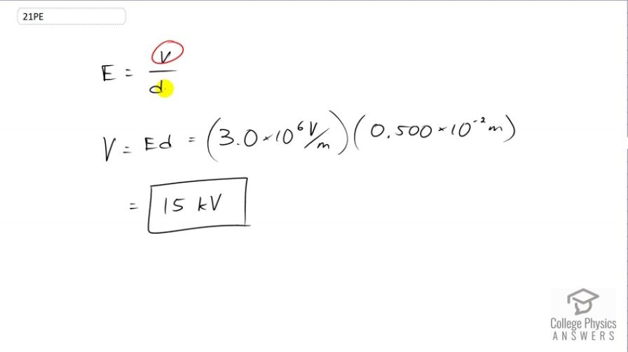This is College Physics Answers with Shaun Dychko. The electric field between two large conducting parallel plates is equal to the potential difference between them divided by the separation between them and we can solve for V by multiplying both sides by d. So, the voltage is gonna be the electric field times d. So, that’s 3.0 times ten to the six volts per meter which is the maximum electric field that we can have in air before sparks start to fly through the air multiplied by the 0.500 centimetres which is times ten to the minus two meters and that gives 15 kilo-volts.