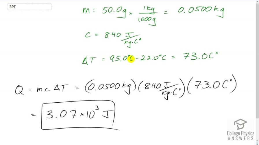 This is College Physics Answers with Shaun Dychko. The 50 gram glass of baby bottle is going to be heated up from a temperature of 22 degrees Celsius to 95 degrees Celsius. We'll convert the mass into kilograms because our formulas require M K S units, meters, kilograms, and seconds. And, we'll take the specific heat of glass, which 840 Joules per kilogram per Celsius degree. And, we'll find the change of temperature, which is 95 minus 22 which is 73 Celsius degrees. And all these numbers can be plugged into this formula for heat transfer, which is mass of the glass times the specific heat of glass times the change in temperature. So, that's 0.05 kilograms times 840 Joules per kilogram per Celsius degree, time 73 Celsius degrees, which gives a heat transfer of 3.07 times ten to the three Joules.