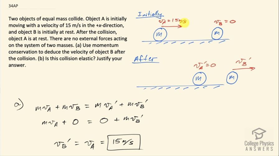 Two objects of equal mass collide. Object A is initially moving with a velocity of 15 m/s in the +x-direction, and object B is initially at rest. After the collision, object A is at rest. There are no external forces acting on the system of two masses. (a) Use momentum conservation to deduce the velocity of object B after the collision. (b) Is this collision elastic? Justify your answer.
