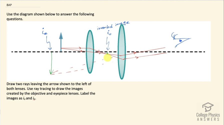 This is College Physics Answers with Shaun Dychko. This is the objective lens that is closest to the object and it has to produce an image that is between the objective lens and the eyepiece lens— it has to be a real image— and so it's going to be an inverted image that is smaller than the objective and then this image, which is labeled i o for image created by the objective then serves as the object for the eyepiece lens and this will be created at a position inside of the focal point of this eyepiece lens and so it's going to act as a magnifying glass and it's going to produce a virtual image that is much larger than the object.